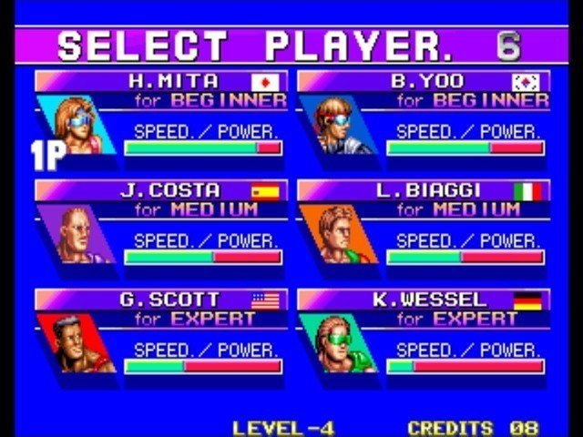 Para seleccionar tenemos 6 personajes diferentes, cada uno con su agilidad, fuerza y disparo especial. Como curiosidad, entre los personajes hay un español llamado J. Costa, equilibrado en fuerza y agilidad. Los disparos especiales se pueden realizar cuando el frisbee queda suspendido en el aire y el jugador se coloca debajo para cargar el tiro hasta que el frisbee cae. Una vez el tiro está cargado, estos especiales son casi imposibles de parar por el contrario.