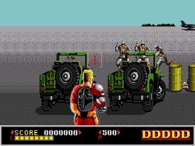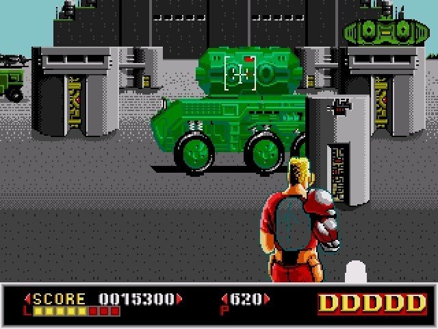Explicada esta apasionante historia, ya nos podemos poner a pegar tiros a todo lo que se mueve en los 9 niveles del juego (6 en las versiones domésticas). El protagonista lo vemos siempre de espaldas, al estilo de los shooters en tercera persona. Controlando la mira del arma, tenemos que ir derribando a todos los enemigos que veamos, que van desde simples soldados a tanques. Para enfretarnos, tenemos mejoras de armas y poderosas granadas. El avance por los escenarios es automático, así que solo nos tenemos que preocupar de aniquilar enemigos (¿a que suena bien?).