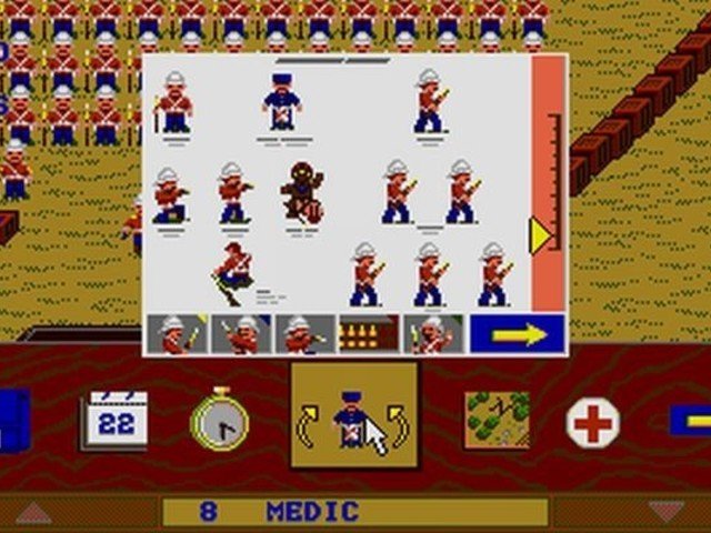 En la parte inferior de la pantalla, nos encontramos la interfaz del juego. Además del cargado y guardado de la partida, podremos acceder a la pantalla de órdenes para nuestros soldados. En ella podremos rotar a nuestro soldado para orientar su potencia de fuego, así como para órdenes específicas (reparto de munición o curar a un soldado herido), así como las de movimiento. Hay tres velocidades: caminar, que nos permitirá escalar muros; paso ligero, nos moveremos más rápido pero se cansarán antes; y carga, donde nuestros soldados cargarán contra las hordas enemigas, maximizando sus bajas pero, ojo, nuestros soldados se cansarán mucho más.