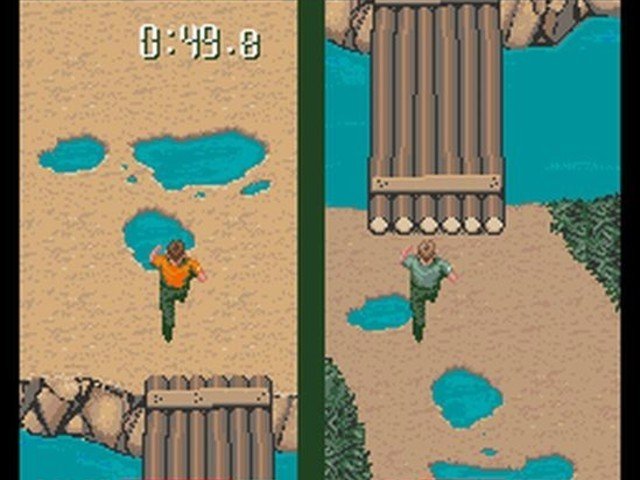 Prueba 3 - Carrera Iron Man: Parecida a la primera prueba, pero la vista es aérea y el scroll vertical. En esta pantalla deberemos sortear otro tipo de obstáculos mientras corremos, como charcos o rocas que deberemos saltar, ríos por los que deberemos cruzar por el puente y siempre evitando meternos en la hierba alta, ya que nos ralentizaremos. También hay una parte que deberemos cruzar el río a nado evitando los troncos o utilizando una canoa. Como en la primera prueba, tenemos un tiempo limitado para completar la pantalla.