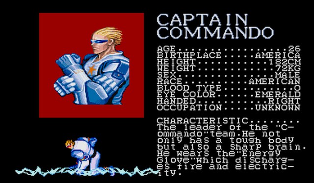 - Captain Commando: El protagonista del juego del cual ya hemos hablado. Equipado con un traje de alta tecnología, es capaz de lanzar fuego y electrocutar a sus enemigos usando sus guantes especiales. Su ataque especial es un ataque eléctrico al golpear el suelo.