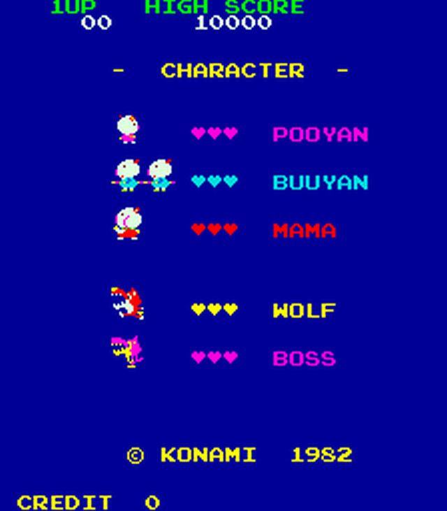 Pooyan fue lanzado en 1982, desarrollado y distribuido por Konami. La versión original es la arcade, pero el juego fue versionado a multitud de plataformas de la época, entre las que se encuentran la ya mencionada NES, Atari 2600, MSX y C64.
