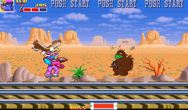Al empezar la partida nos encontramos con juego Run and Gun en el que tenemos que disparar a todo enemigo que encontremos en la pantalla. Este juego permite jugar hasta cuatro jugadores simultáneamente. Podemos elegir entre los personajes mencionados anteriormente, cuyas diferencias entre si solo son estéticas. En cuanto a movimientos, podemos disparar nuestra arma, saltar o usar el movimiento especial. El movimiento especial básico es una embestida, pero si hemos recogido alguno de los power ups disponibles realizaremos un movimiento más poderoso. También podemos recoger un power up que mejora nuestro disparo, haciendo disparar tres balas a la vez. En pantalla podemos ver la puntuación que llevamos, la cual aumentamos derrotando a enemigos y recogiendo oro, los tres puntos de daño que soporta nuestro personaje y el número de vidas disponible.