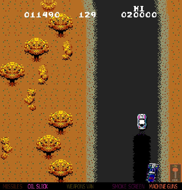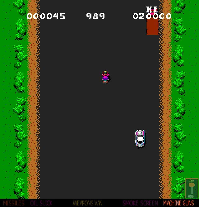 Para atacar a los coches enemigos, podemos utilizar diferentes armas. La básica es la ametralladora, que nos permite atacar a los vehículos que tengamos delante. Cuando entramos en una nueva zona, aparece un camión aliado en el que podemos entrar para conseguir nuevas armas, las cuales son manchas de aceite, pantallas de humo y misiles para atacar vehículos aéreos.