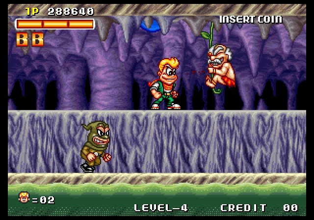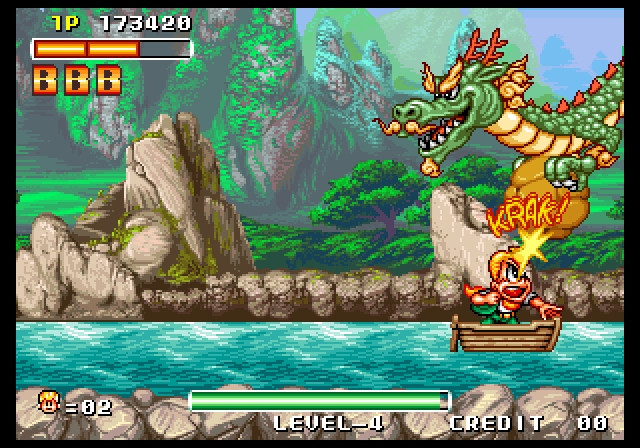 Los enemigos son muchos y muy variados. Encontramos desde los simples esbirros que vendrán a por nosotros, hasta animales como cangrejos o buitres. Cada uno de ellos tiene su propio patrón de ataque y movimiento, y alguno de ellos nos tirarán todo tipo de objetos para acabar con nosotros. Por suerte, gran parte de esos objetos los podemos romper o desviar golpeándolos con nuestro arma. Por supuesto, los jefes de final de nivel no faltan, y son muy impresionantes, con un tamaño enorme y unos diseños muy originales. Personalmente, el último jefe del juego me recuerda a otro juego de la misma compañía, Tumblepop, ya que se juega en un escenario bastante parecido a los que vemos en este juego.