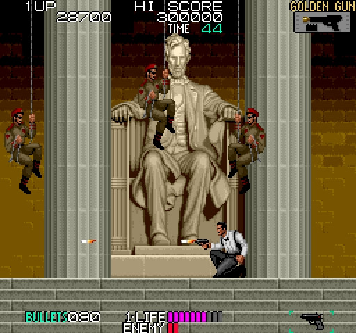 La duración es bastante corta, pudiendo completar el juego en unos 20 minutos. Esto hace, junto a la variedad de escenarios, que el juego no resulte repetitivo en ningún momento. Empezamos la aventura en National Mall de Washington, donde podemos ver la enorme estatua de Abraham Lincoln en su memorial, y a partir de ahí pasamos por diferentes lugares como un yate y una cueva hasta llegar a la base secreta del grupo terrorista, en la que encontraremos un imponente misil nuclear. Los niveles están llenos de esbirros que quieren acabar con nuestra misión. Encontramos desde simples soldados que nos atacarán con sus puños a forzudos que nos lanzarán barriles como Donkey Kong. Por otra parte, los terroristas han adiestrado a perros, tigres e incluso tiburones para que sean armas letales. Por supuesto, al final de cada nivel nos espera el jefe de turno para ponernos en un aprieto.