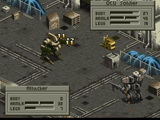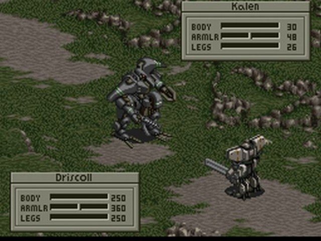 Una vez explicada esta primera fase, pasemos a la fase de batalla. Como hemos comentado anteriormente, es un tablero dividido en cuadrados y se desarrolla por turnos. Cada mecha tiene su vida repartida entre las partes de su estructura y, la pérdida de una de ellas, tiene diferentes consecuencias. Perder un brazo (y el hombro, ya que se pierde conjuntamente) supone la pérdida de la capacidad de utilizar las armas que en ese brazo tuviéramos y, en el caso de perder ambos brazos, el mecha se quedará sin poder atacar. Si nos destruyen las piernas perderemos la capacidad de movimiento, pudiendo movernos solo a celdas adyacentes. El más crítico es que destruyan el cuerpo, ya que en ese caso, el mecha explotará y dispondremos de un efectivo menos en combate. Hay ciertos ítems que nos permitirán en nuestro turno reparar alguna de las partes antes de que sean completamente destruidas. Recordaréis que dijimos que a veces nos interesaría un solo impacto fuerte, o más impactos pero de menor intensidad. Imaginaos que tenéis a un adversario que tiene alguna parte de su cuerpo muy debilitada, quizá nos interese mejor realizar más impactos de menor intensidad para ver si podemos destruir definitivamente esa parte del mecha y, así, tener una ventaja táctica. Al utilizar un arma, cada impacto golpeará al mecha enemigo en un lugar aleatorio, no lo podremos elegir.